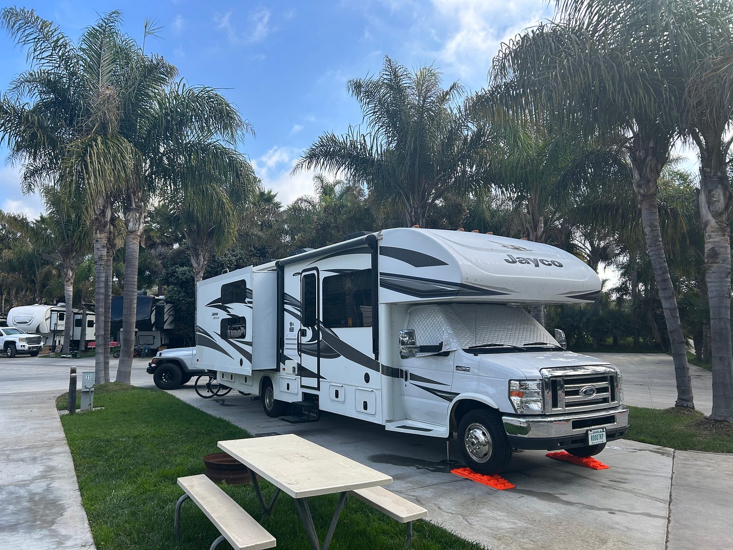 We are currently heading west on CA-126. This morning was a frenzied affair of last minute packing, repairs and resupplying the RV before heading out for Ventura. There was a palpable change in focus and relaxation level as we locked in to our familiar routines of preparing the Jayco, the Jeep, and the bicycles for departure.